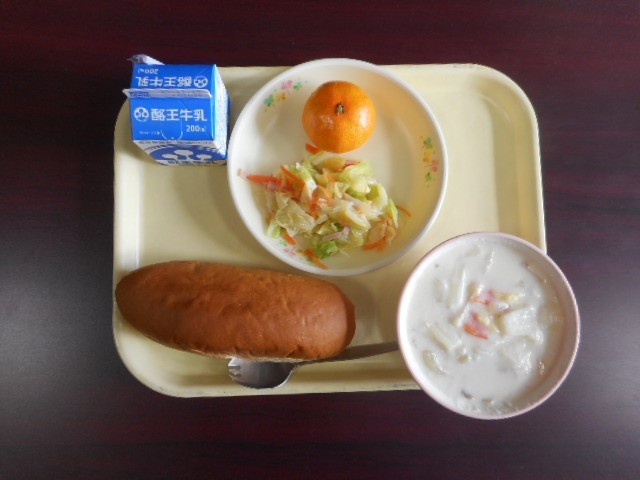 今日の給食のメニューは、黒砂糖パン、白菜のクリーム煮、フレンチサラダ、みかん、牛乳 です。