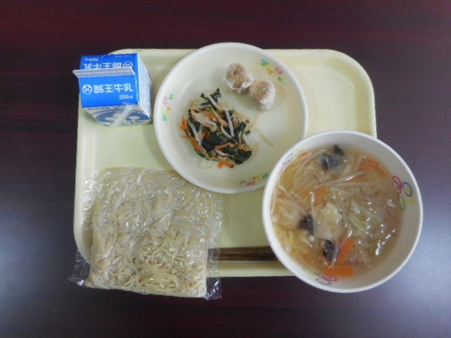 今日の給食のメニューは、ちゃんぽん麺、肉シュウマイ、ほうれん草のナムル、牛乳 でした。