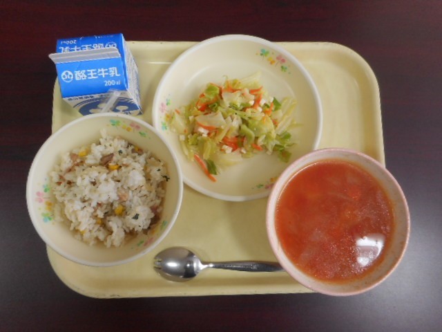 今日の給食のメニューは、コーンピラフ、チーズサラダ、ミネストローネ、牛乳 です。