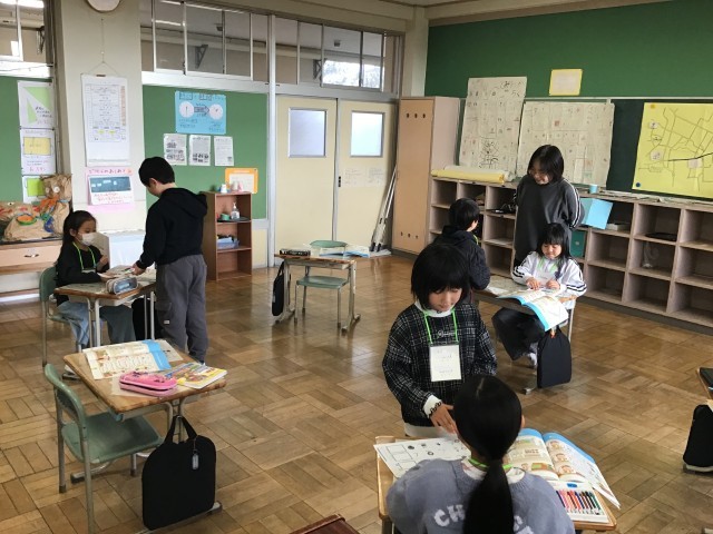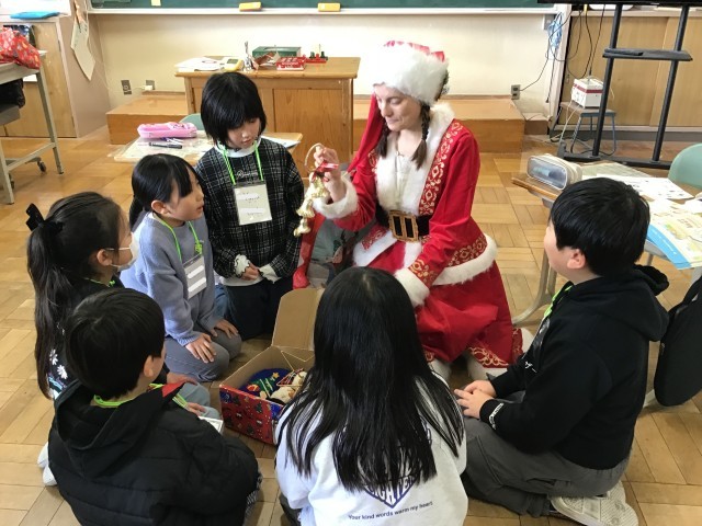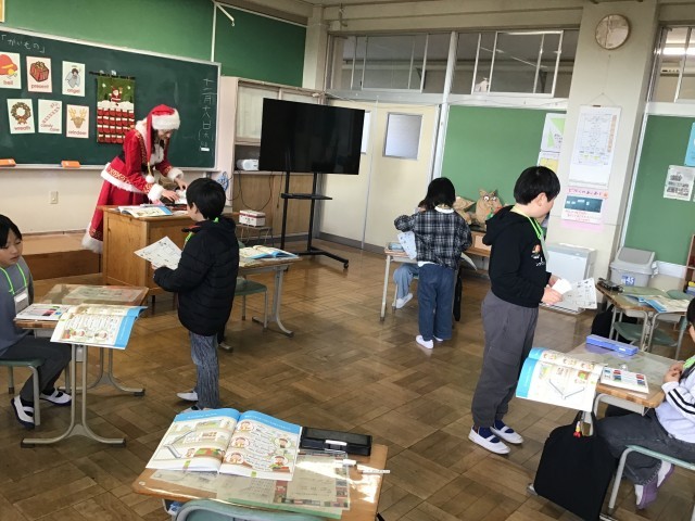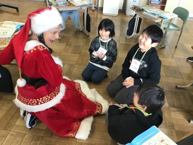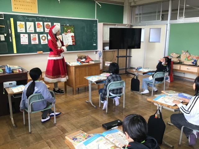次の時間は2年生です。2年生は英語表現「かいものあそび」の学習です。クリスマスに関する物の名前、お金の言い方の練習をした後、お店屋さんのやり方の説明を聞き、スタートです。買い物遊びなので「ハウ マッチ?」が入ります。最初はドキドキしている感じが見えましたが、回数を重ねるごとにみんな笑顔でやりとりをしていました。最後は、今日の買い物遊びで使ったイラストの実物を見せていただきました。クロイ先生のサンタさん、とてもお似合いですね。