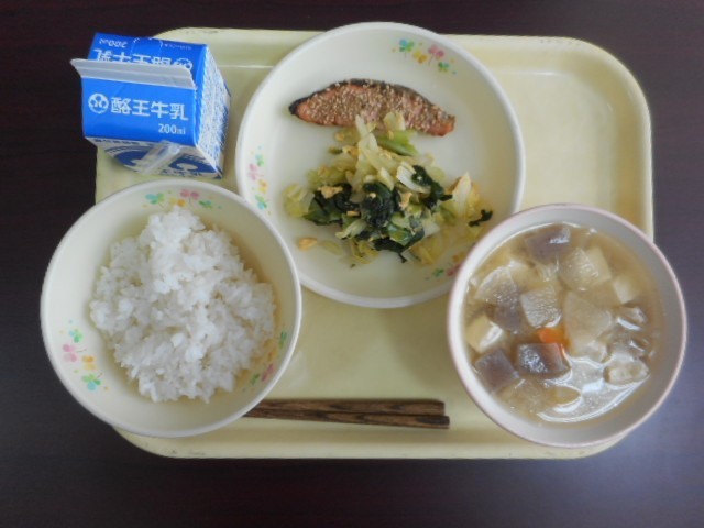 今日の給食は【食育の日献立】です。 ごはん、鮭の香味焼き、ほうれん草とたまごの和え物、豚汁、牛乳 でした。