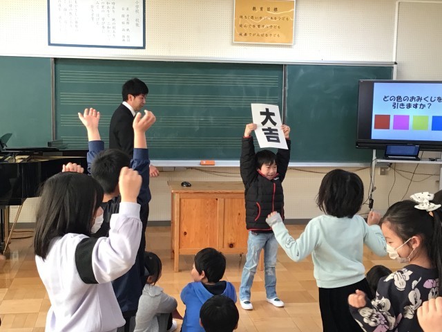 本日、82日間の2学期が無事に終了いたしました。保護者の皆様のご協力、本当にありがとうございました。3年生と6年生の代表児童が、2学期の反省と冬休みの過ごし方について発表しました。それぞれ、2学期の自分をしっかり振り返り、話をしていました。私からは、2学期の振り返り、できるようになったことは自信をもってほしいこと、もう少しだと思ったことは、3学期の、目標とすればよいことなどを話しました。私から冬休みの約束を1つだけしました。子どもたちに「なんだと思いますか?」と問いかけたところ、真っ先に返ってきた答えが「宿題」でした。思わず、微笑んでしまいました。担任の先生の話をしっかり聞いて、心に刻んだのですね。私の中の答えは「命を大切にすること」でしたが、三和っ子たちは、きっと素敵な冬休みにしてくれると思いました。終業式の後は、生徒指導担当の先生から、なんと「おみくじ」で、冬休みに気をつけることについてお話がありました。私は、中吉でした。おみくじでブルーを選んだ三和っ子は中吉です。それぞれが決めたおみくじカラーについてのお話をぜひ、聞いてみてください。