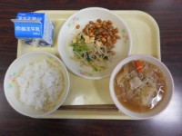 今日の給食は、味噌ラーメン、肉団子のもち米蒸し、もやしのラー油和え、牛乳でした。