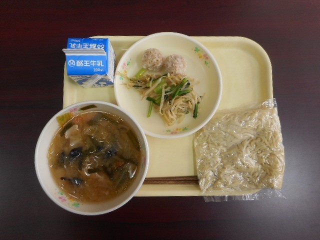 今日の給食は、味噌ラーメン、肉団子のもち米蒸し、もやしのラー油和え、牛乳でした。