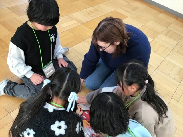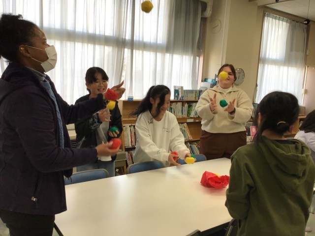 最後は、みんなでお手玉をしたり、福笑いをしたり、こまを回そうと頑張ったりしながら、AETと楽しい時間を過ごしました。最後の最後に、みんなで「ハイチーズ!!」