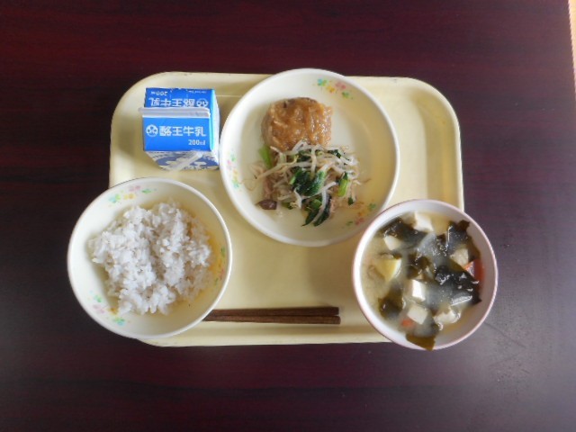 今日の給食は、麦ごはん、ハンバーグのバーベキューソースかけ、小松菜ときのこの和え物、わかめ汁、、牛乳 です。