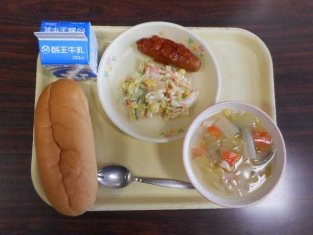今日の給食は「セルフサンド」 切り目入りコッペパン、ウインナーのケチャップソースかけ、コールスロー、白菜スープ、牛乳 です。