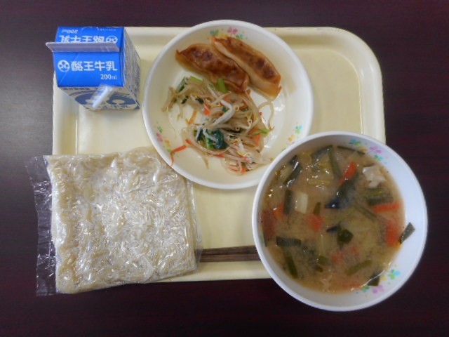 今日の給食は、味噌ラーメン、餃子、もやしのラー油和え、牛乳 です。