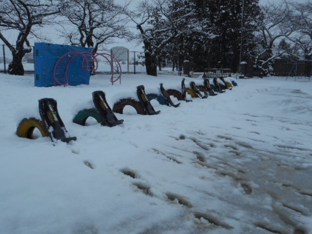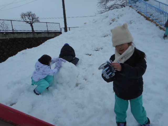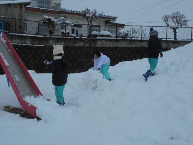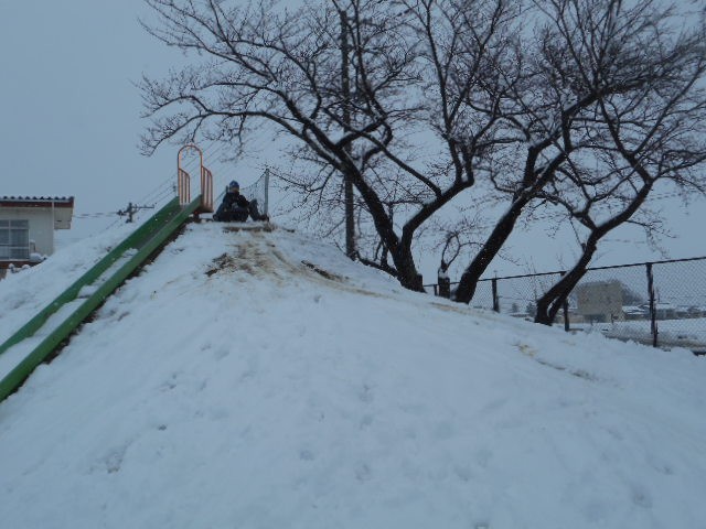 「今年は雪遊びができないね。」と話していたら、どっさり雪が降りました。雪かきは腰が痛くなって大変でしたが、1年生は「待ってました!」とばかりに元気に外へ出ていきました。築山は絶好のそり滑りの場です。そり滑りをしたり、大きな雪玉作ったり、楽しく活動しました。水分を含んだ雪なので転がすとすぐに大きくなり、重くて転がすのが大変でした。1年生が遊んだ後は、業間に向けて、用務員さんが築山のそり滑りコースの整備をしてくださいました。