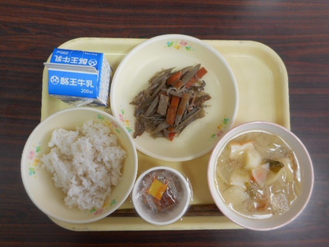 今日の給食は、麦ごはん、納豆、五目きんぴら、生揚げのみそ汁、牛乳 です。