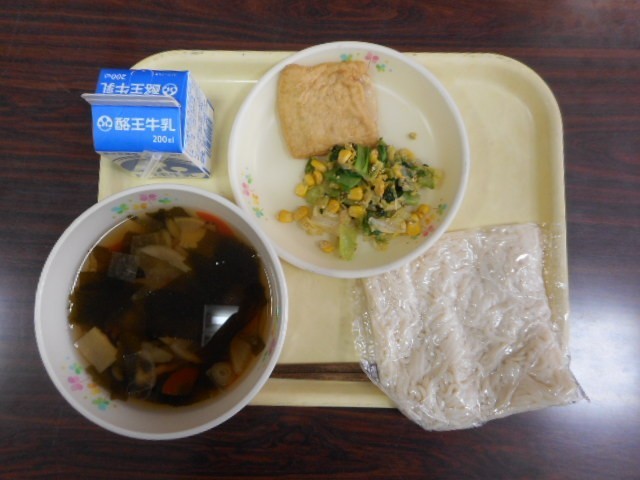 今日の給食は、わかめうどん、きつねもち、胡麻風味和え、牛乳です。