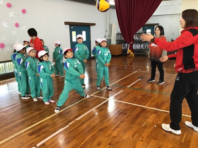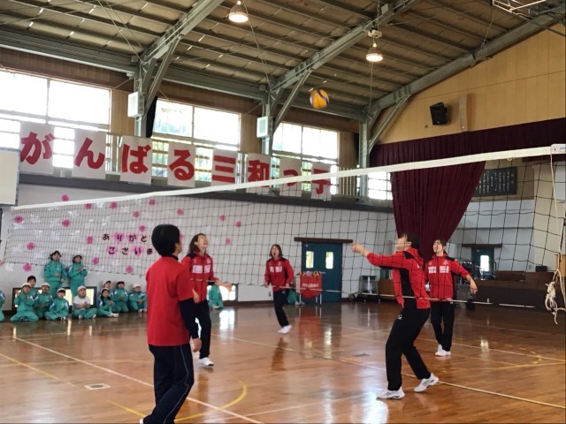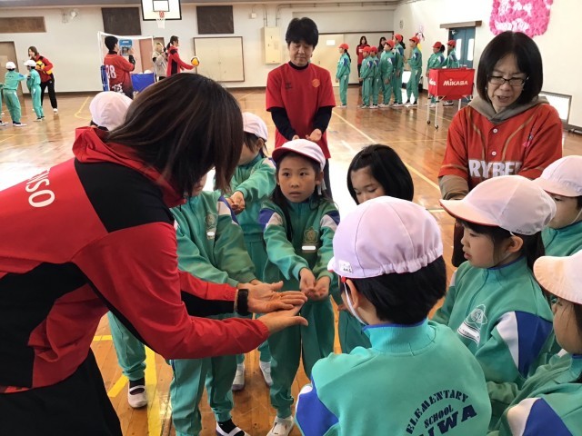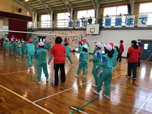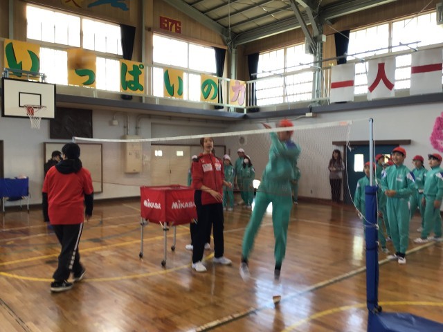 今日は、デンソーエアリービーズドリーム教室が行われました。まずは、バレーボール教室です。各学年、ブロックごとに、選手の皆さんからレシーブ、スパイクなどを教えていただきました。低学年の三和っ子も、積極的にボールに向かっていきました。選手のスパイクを間近で見た、三和っ子たちは、その速さと威力にびっくり!!まさか、次に待っているのは、「先生方がそのスパイクを受ける」とは、夢にも思わなかったでしょう。先生方がくらいついている姿を見て、三和っ子たちもコートの中にたくさん入ってきました。