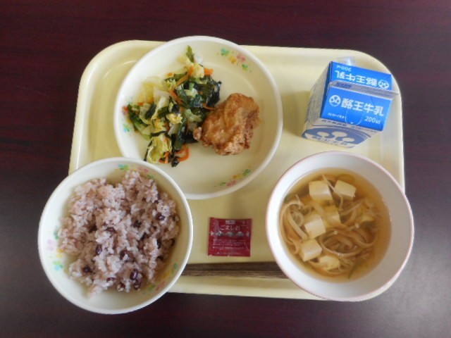 赤飯、ごま塩、鶏肉のから揚げ、わかめと野菜の和え物、えのきたけのすまし汁、牛乳です。