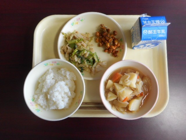 昨日の給食は、ごはん、肉じゃが、春キャベツのおひたし、小魚と大豆の佃煮、牛乳でした。