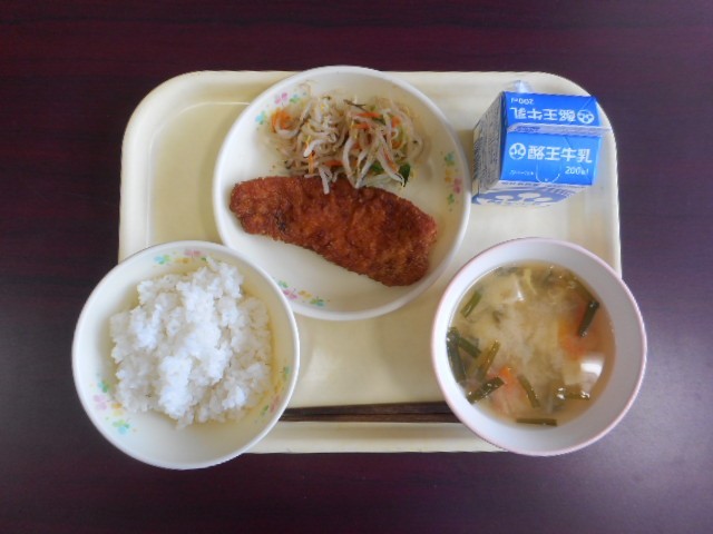 ご飯、ソースカツ、のりあえ、にらのみそ汁、牛乳がお盆の上に並びました。