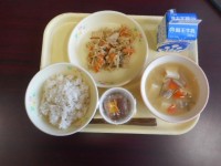 今日の給食の献立は、「豚キムチ丼、牛乳、小松菜ともやしのナムル、中華スープ」です。608キロカロリーです。