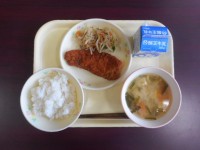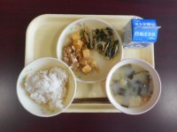 今日の給食の献立は、「麦ご飯、牛乳、マーボー豆腐、蒸しぎょうざ、モヤシと小松菜のナムル」です。