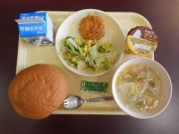 米粉パン、牛乳、白菜のクリーム煮、キャベツサラダでした。温かいクリーム煮が優しい味でとてもおいしかったです。