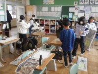 長井先生との初めての図工の授業。絵の具を使って、好きな色を作りました。筆の使い方を確かめながら、いろいろな点と線を画用紙に描きました。