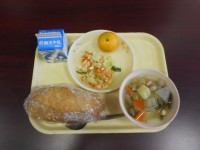今日の給食は、 アップルパン、かぼちゃ入りすいとん、チキンと小松菜のサラダ、キ...