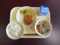 今日の給食は、ごはん、メンチカツ、大豆入り和風サラダ、油揚げとほうれん草のみそ汁...