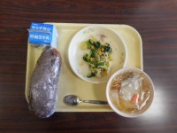 今日の給食は、ココア揚げパン、チキンと小松菜の和え物、ワンタンスープ、はるか で...