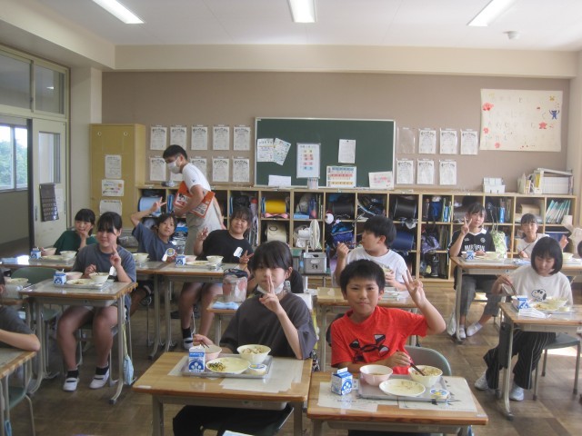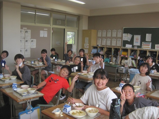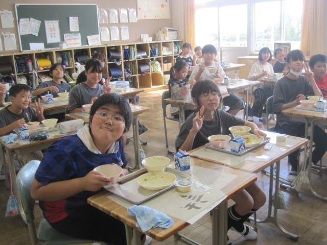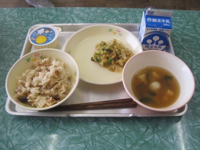 きのこごはん、牛乳、枝豆入りおひたし、お月見スープ、十五夜ゼリー「十五夜献立」