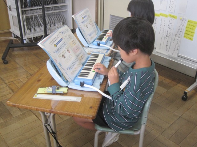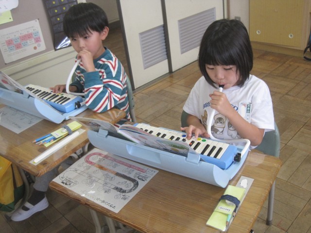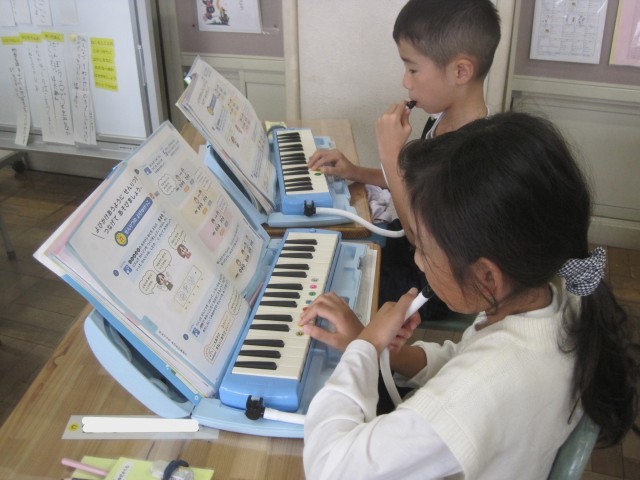 読びかけあうように、旋律をつなげて鍵盤ハーモニカを演奏します。