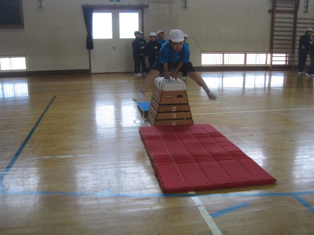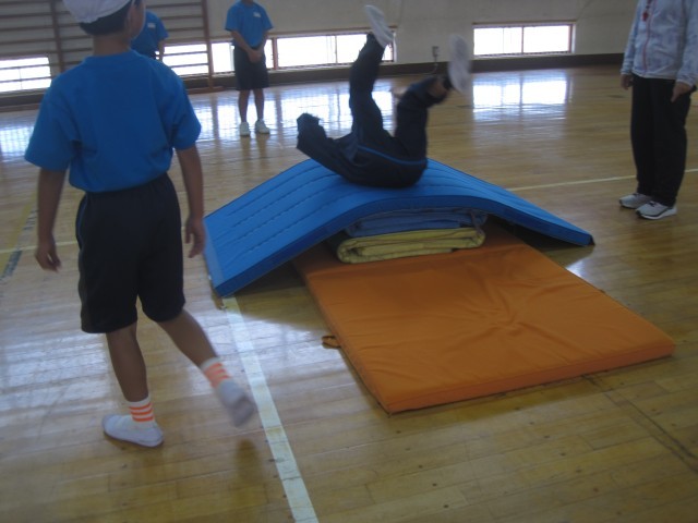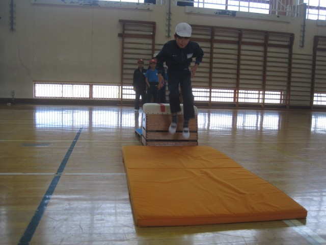 跳び箱運動に取り組みました。切り返し技や回転技を何度も練習していました。