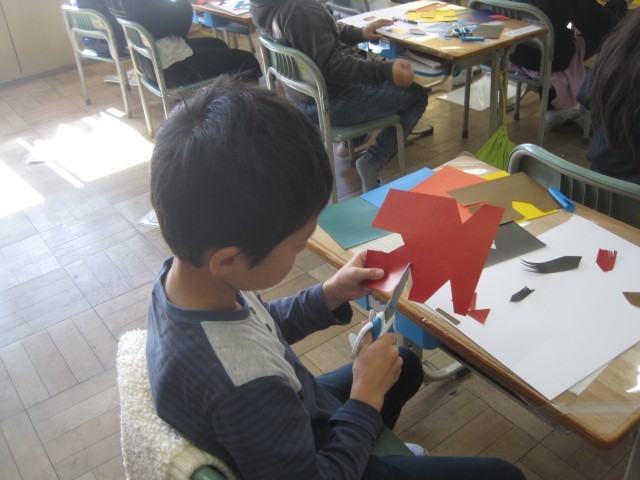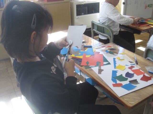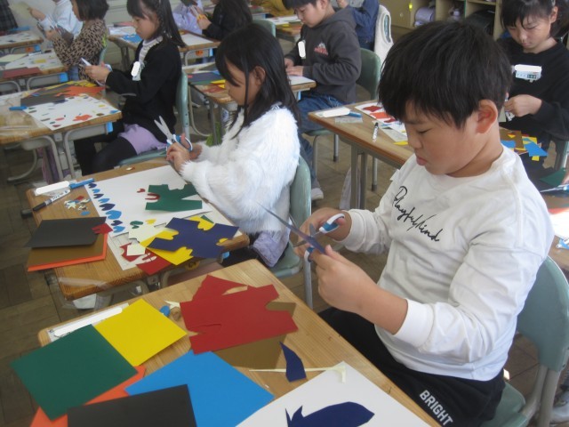 転写できる色紙を使って紙版画を作成中。表現するのに適した形や色を工夫しながら熱心に取り組んでいました。