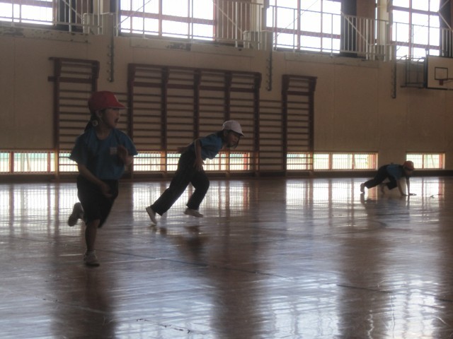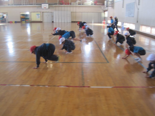 スキップ、カニ走り、ウサギ跳び、バック走などさまざまな動きを取り入れながら体を動かし、基礎体力の向上を目指します。