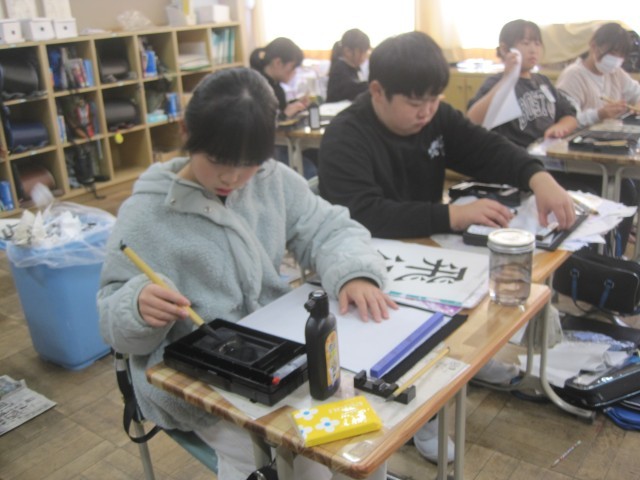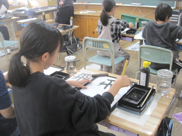 用紙に合った文字の大きさを考えて書きます。「飛」は画数が多いので、字が大きくなりがちです。バランスを考えながら書き進めていました。