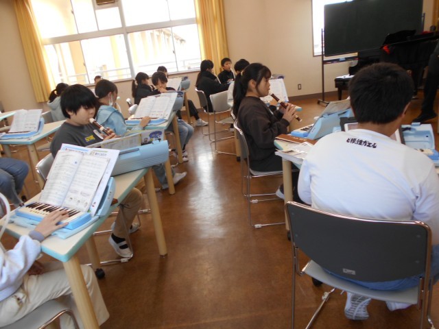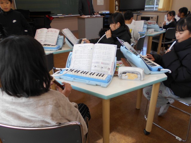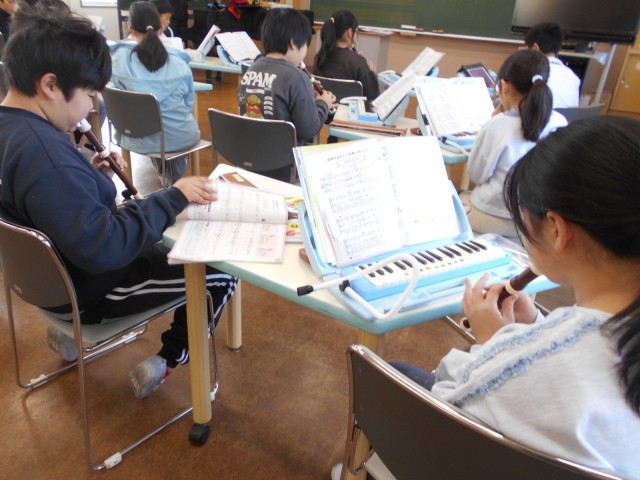 リコーダーや鍵盤ハーモニカなどを使って合奏の練習をします。曲想を生かして、旋律やリズムなど演奏できるよう練習します。