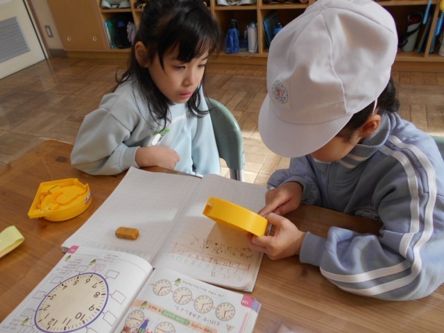 長針と短針の位置関係をもとに、時計の読み方を考えました。