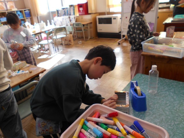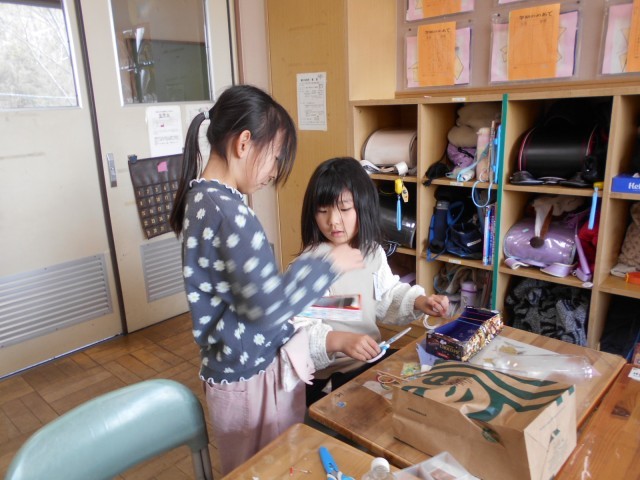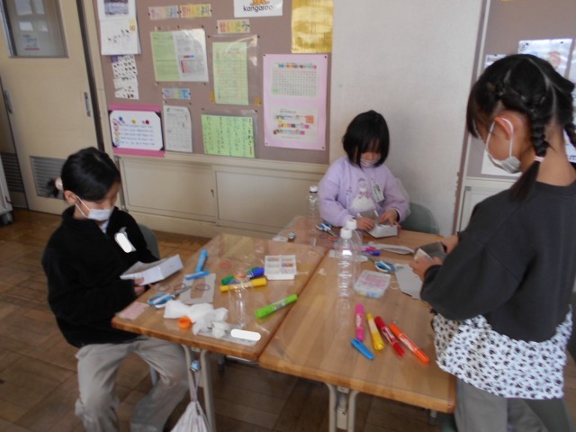 輪ゴムやビーズ、どんぐりなどを使って音の出るおもちゃを作りました。