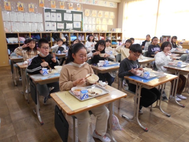 「豆ごはん 牛乳 いわしの梅煮 三色おひたし 南蛮汁」 節分献立でした。