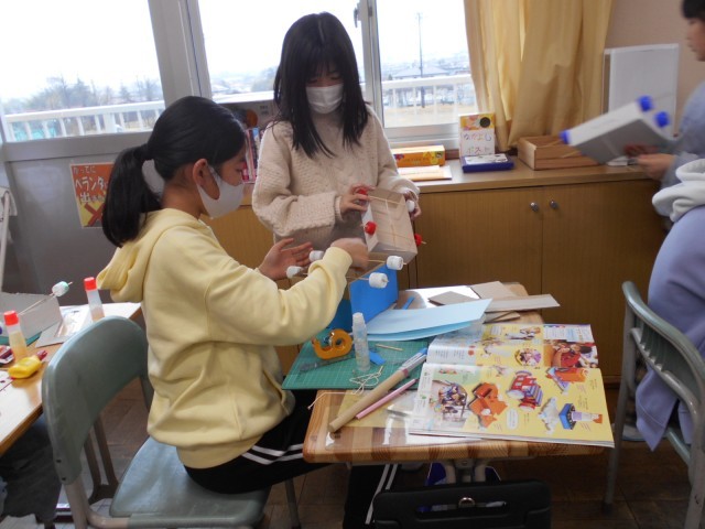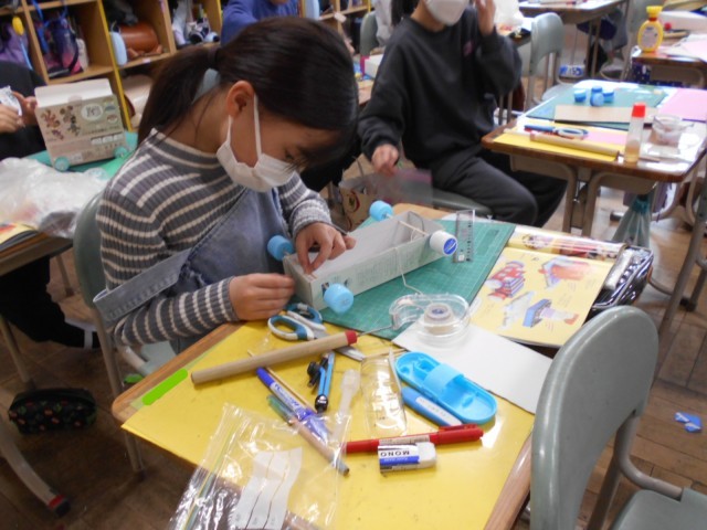 風やゴムで動く車。形や色などを自由に工夫し、オリジナルの夢の乗り物を作ります。