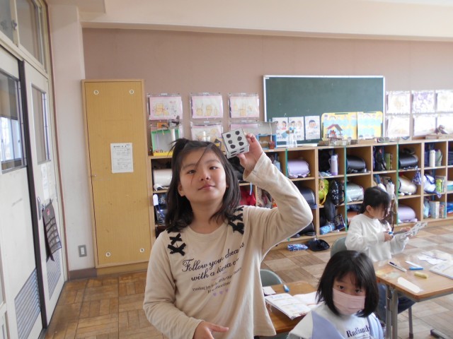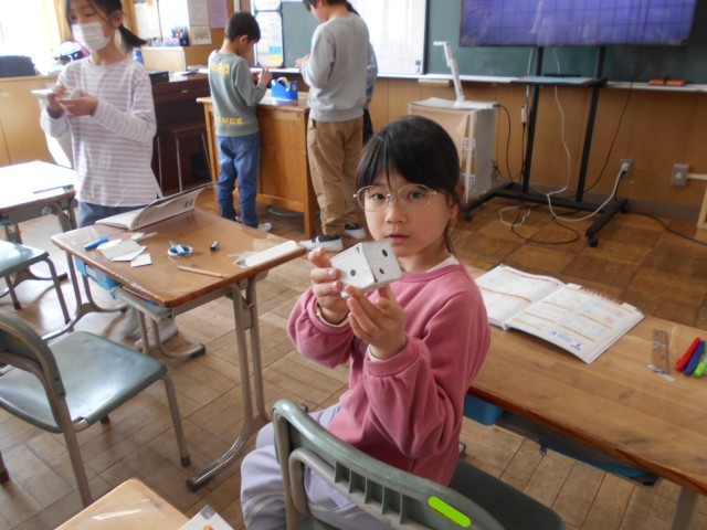 サイコロを作り、頂点や辺、面の数などについて確かめました。