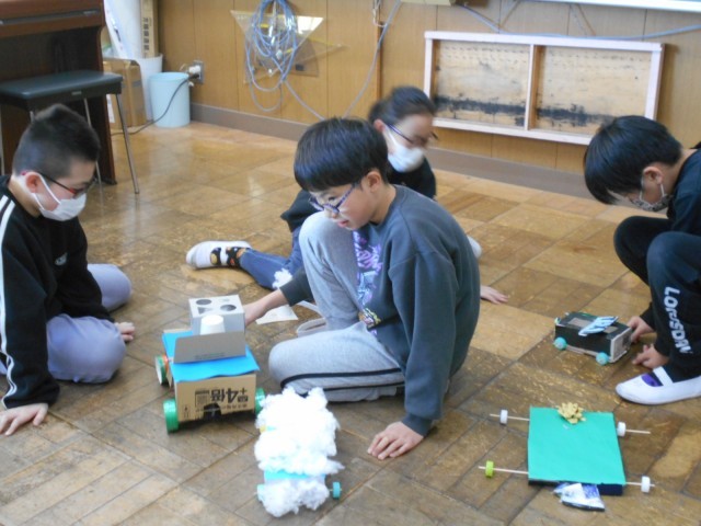 材料の色や形、仕組みを工夫して夢の乗り物を作ります。