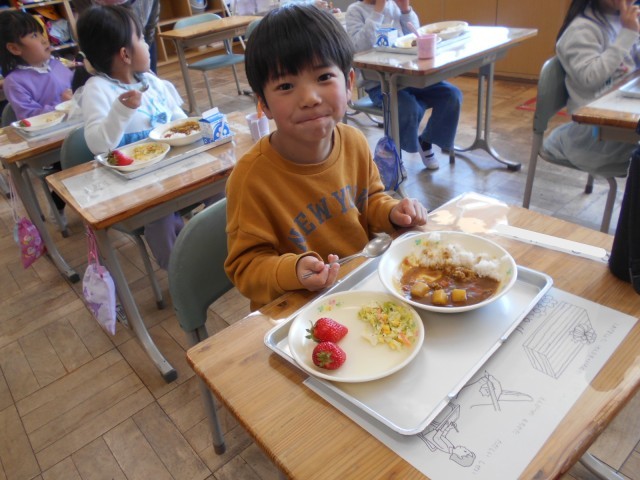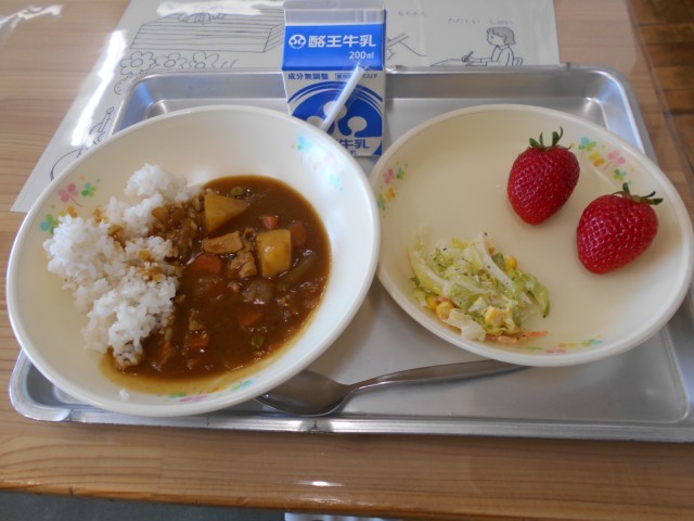 今日の献立は、ポークカレーライス、コーンサラダ、牛乳、イチゴ、「こおりやま お米の日献立」でした。