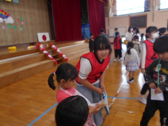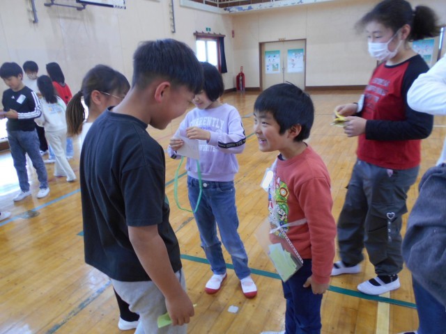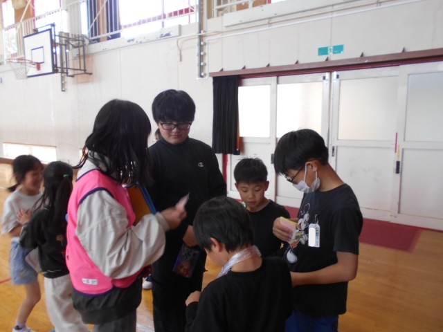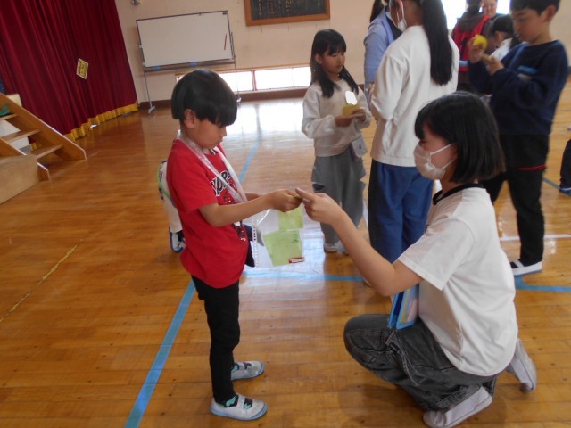 名刺交換ゲームでは、縦割り班のメンバーなどに名刺を渡し、互いに自己紹介をしました。
