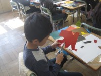 2年生 図画工作。転写できる色紙を使って紙版画を作成中。表現するのに適した形や色...