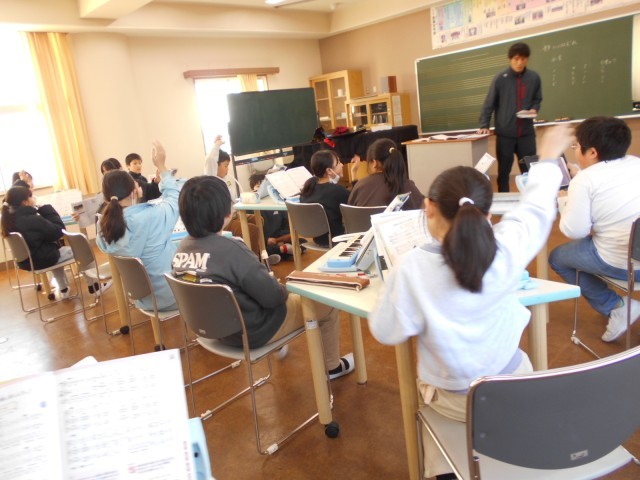 5年生 音楽。リコーダーや鍵盤ハーモニカなどを使って合奏の練習をします。曲想を生...