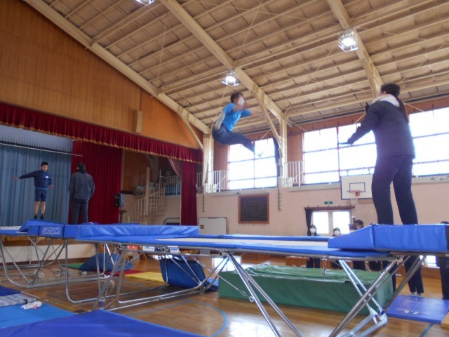 今年度もトランポリン教室を実施しました。1年生は初めての体験ですが、繰り返して上...