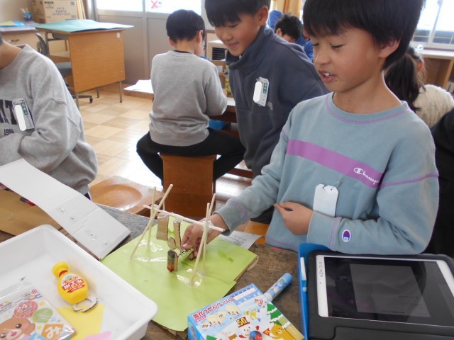 3年生 図画工作。磁石の引き合う力、しりぞけ合う力を利用して動く仕組みを考え...