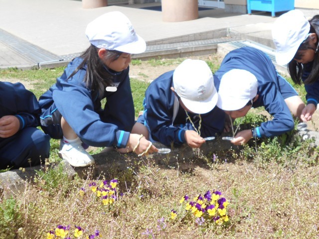 3年生 理科。春の生き物を観察します。虫眼鏡を使って植物の葉の形や花びらのようす...
