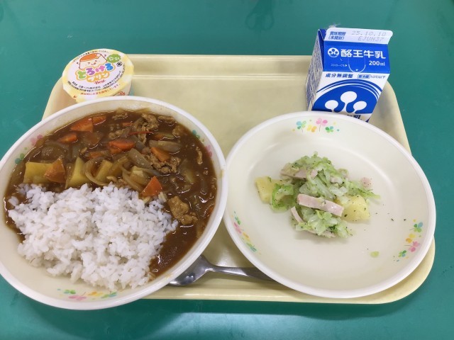 メニューはポークカレーライス、グリーンサラダ、豆乳プリン、牛乳でした。