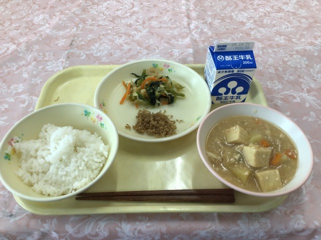 メニューは、ご飯、生揚げの肉味噌煮、からしあえ、チリメンジャコ佃煮、牛乳でした。