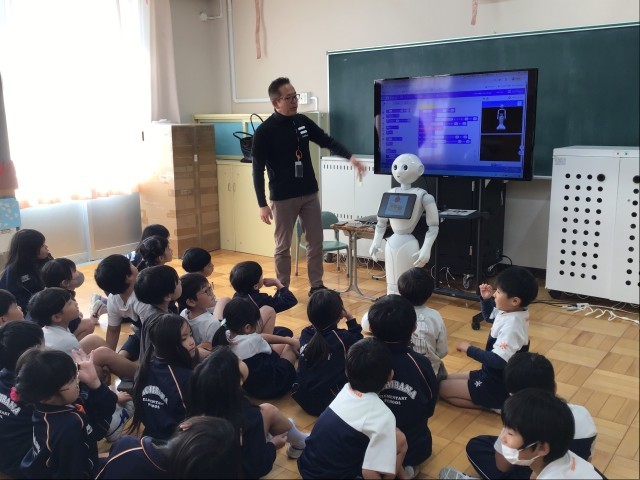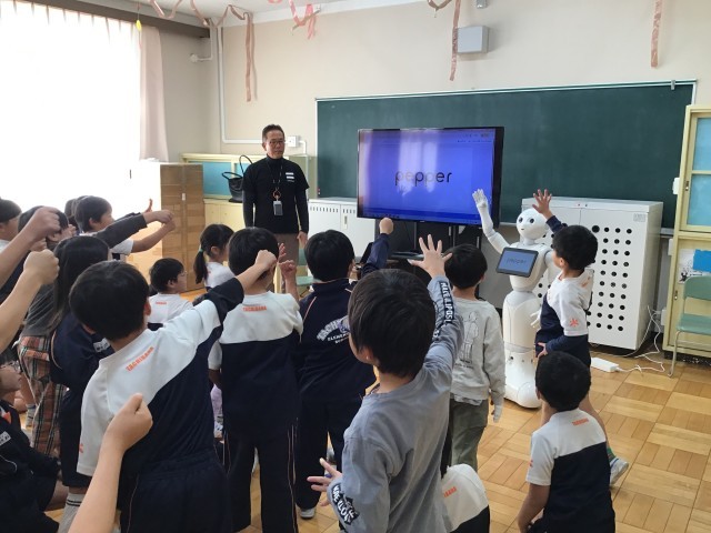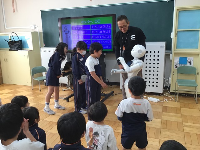ペッパーくんとじゃんけんをしたりおしゃべりをしたり大盛り上がりの2年生。