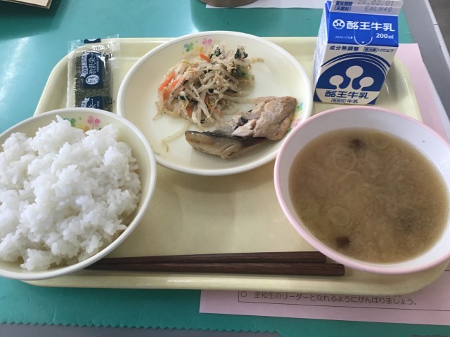 メニューは、ご飯、きのこ汁、サバ照り焼き、ごま酢あえ、味のり、牛乳でした。